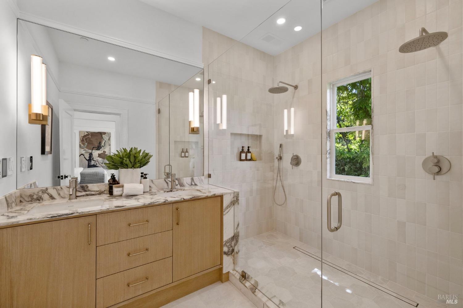 A timeless fusion of elegance and modern living, 150 The Alameda offers a rare opportunity to own a gated 4BD/3BA recently transformed residence on over half an acre in San Anselmo. This 2,434 sq ft home blends classic character with high-end finishes and smart-home technology. Wide-plank European oak floors and a Venetian plaster fireplace define the great room, which opens to a large deck for effortless indoor-outdoor living. The gourmet kitchen boasts Bertazzoni appliances, quartz counters, and a butcher block island crafted from the home's original 1926 countertops. A spacious 4th bedroom/JADU opens directly to a lush lawn and private bocce court, offering flexible living or guest accommodations. The serene primary suite includes a spa-like bath with heated marble tile and a dual shower. A gated entry, generous off-street parking, and a two-car garage with ample storage complete this refined offering. Smart automation controls lighting, sound, climate, irrigation, and security.